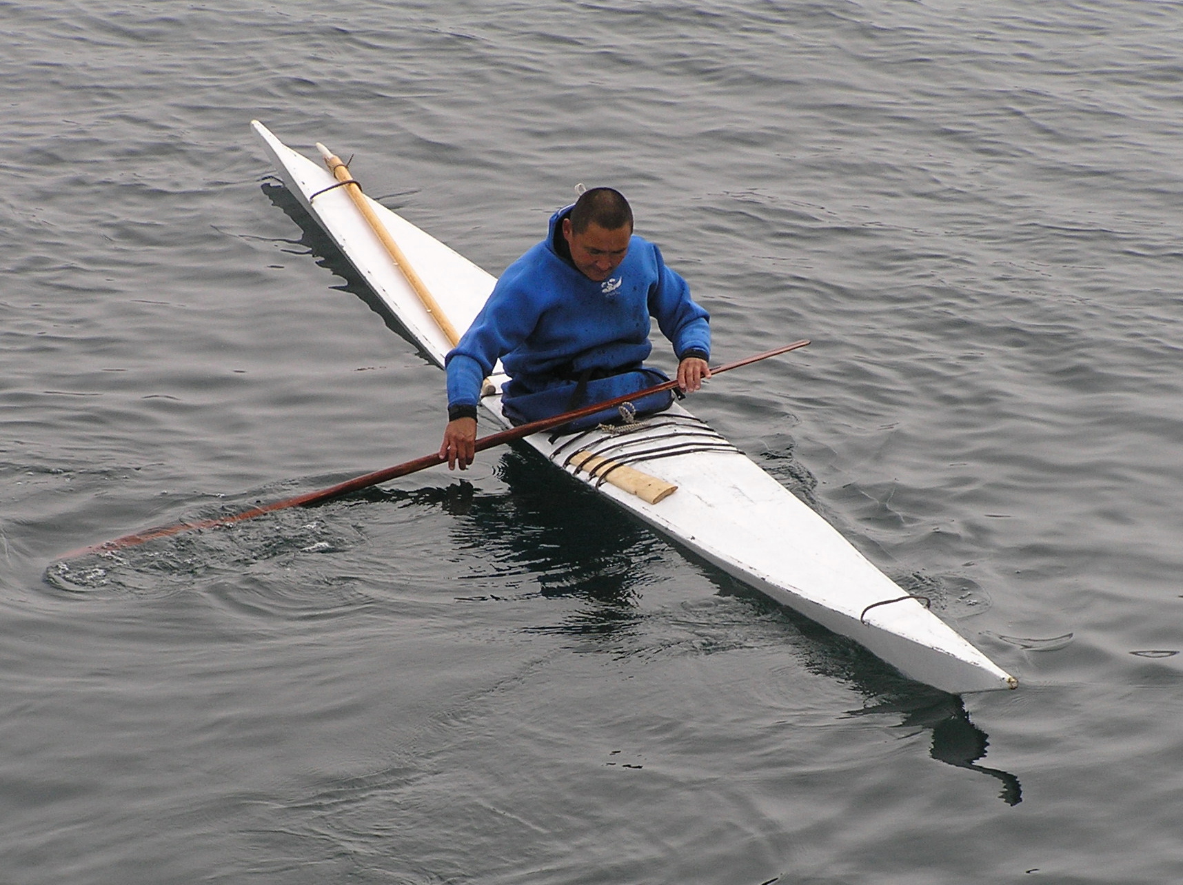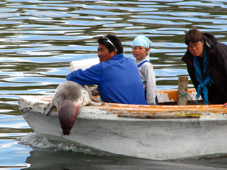 ![]() Sled dog pup | ![]() Kayaks | ![]() Hunters return from a successful seal hunt as we return to our ship |