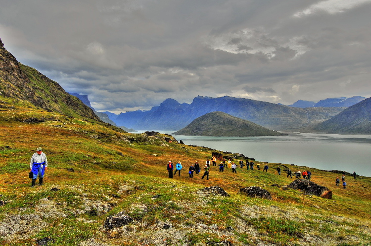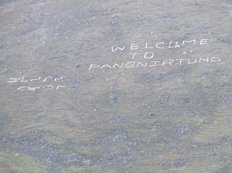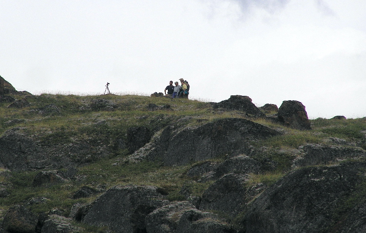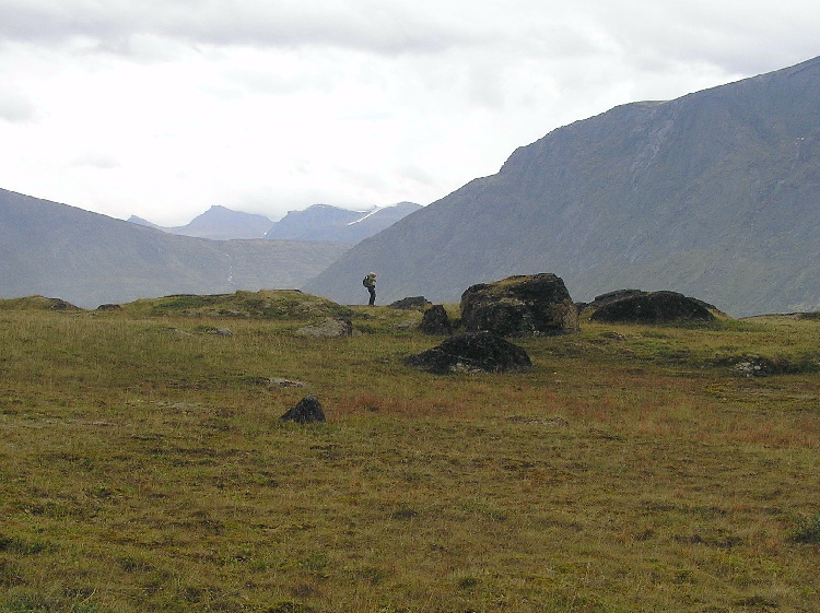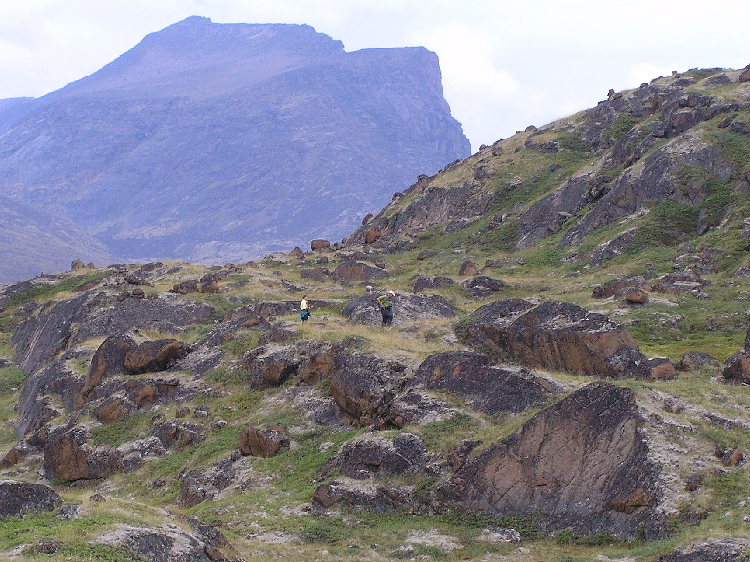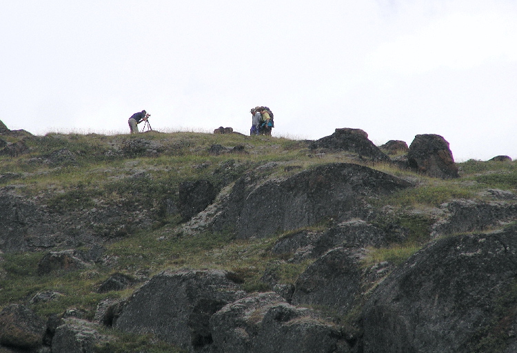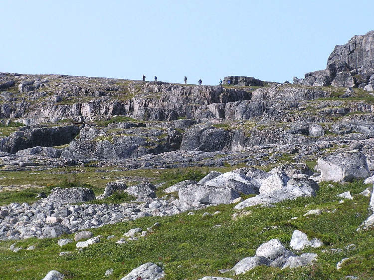 ![]() Passing Pangnirtung (Pang), Baffin Island, on our way to Auyittuq National Park | ![]() Some of us hike uphill at small corner of Auyuittuq | ![]() Mike (& Nan just over the ridge) up ahead & higher - as usual |