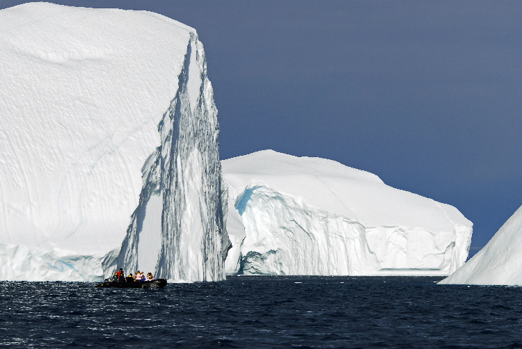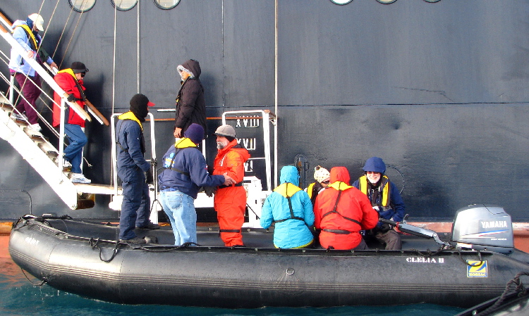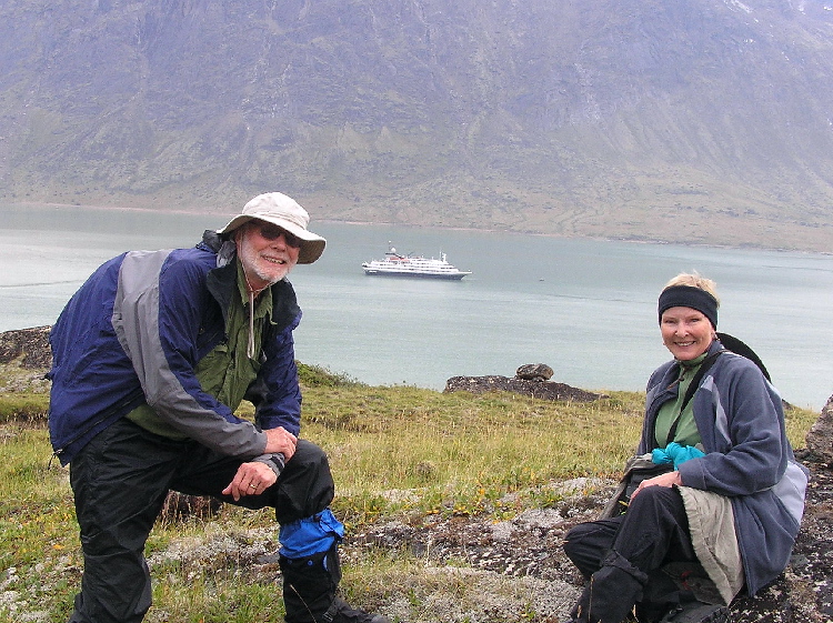 ![]() Boarding zodiacs for cruise among the bergs | ![]() Big bergs | ![]() Mike & Nan berg watching |