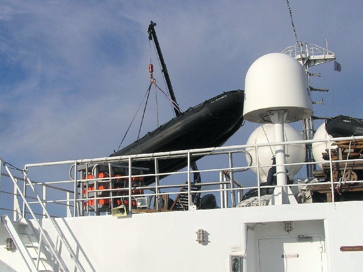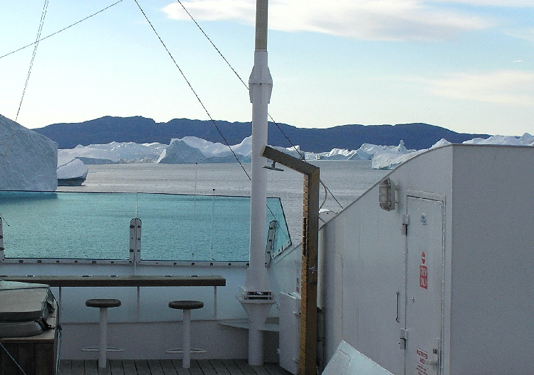 ![]() Leaving Sisimiut | ![]() Approaching the Ilulissat Icefjord 8/16 | ![]() Zodiacs over the side |