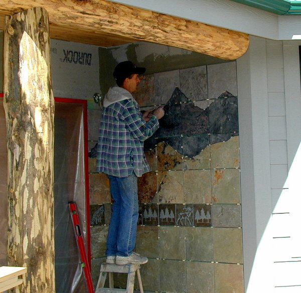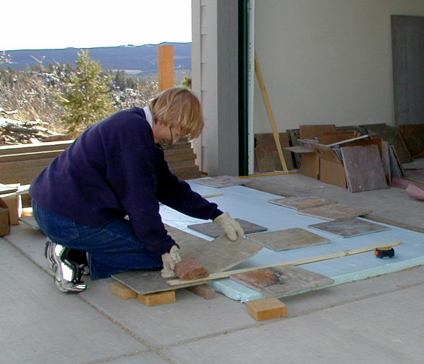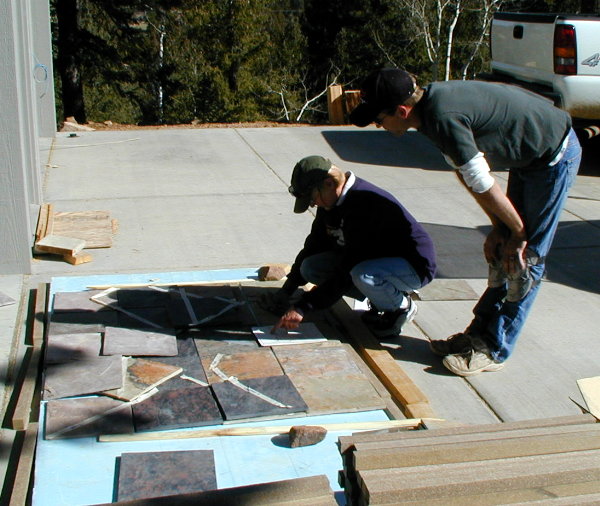 MICHAL LAYS OUT SLATE FOR PORCH WALL 3/21/04